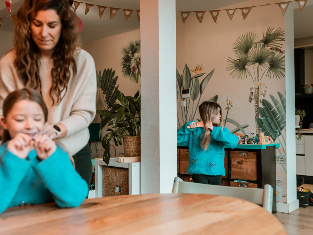 Bijvoorbeeld tijdens het fruit eten, samen koekjes bakken, een spelletje spelen op het vloerkleed, een rondje wandelen door het dorp of met de hond. Ik ga in jullie ritme mee. Geen aansturing, maar gewoon leven.